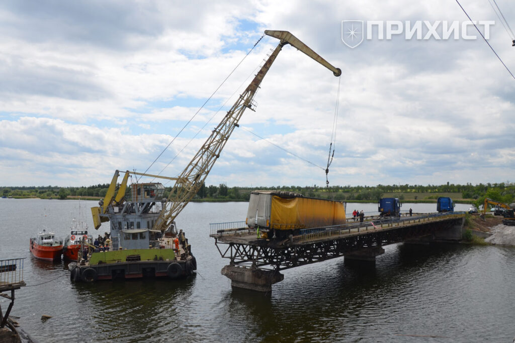 23 мая к разрушенному мосту из речпорта Никополя прибыл плавучий кран, работа которого позволила значительно ускорить и облегчить процесс выемки металлоконструкций из фуры. Для обеспечения подъезда водной техники к месту аварии были задействованы также сотрудники компании ДТЭК.