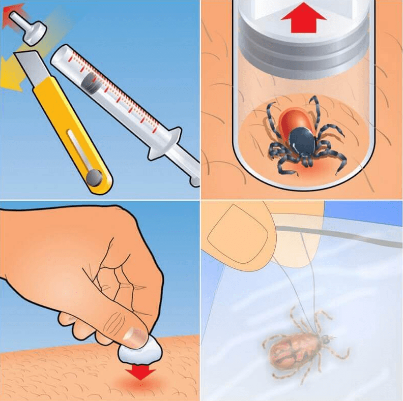 Для манипуляции по извлечению клеща понадобится шприц объемом 2 мл и нож. Ножом удаляется передняя часть шприца с получением ровного места среза. Затем этим приспособлением плотно захватывают место укуса клеща, откачивают оттуда воздух. Создавшийся вакуум выталкивает паразита.