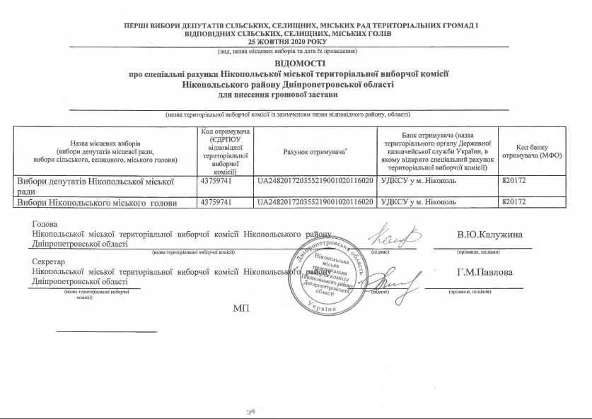 На официальном сайте городского совета появился документ: “Сведения о специальных счетах Никопольского городского территориальной избирательной комиссии Никопольского района Днепропетровской области для внесения денежного залога”, где указаны реквизиты, по которым кандидаты в мэры и депутаты могут внести залог для участия в выборах.