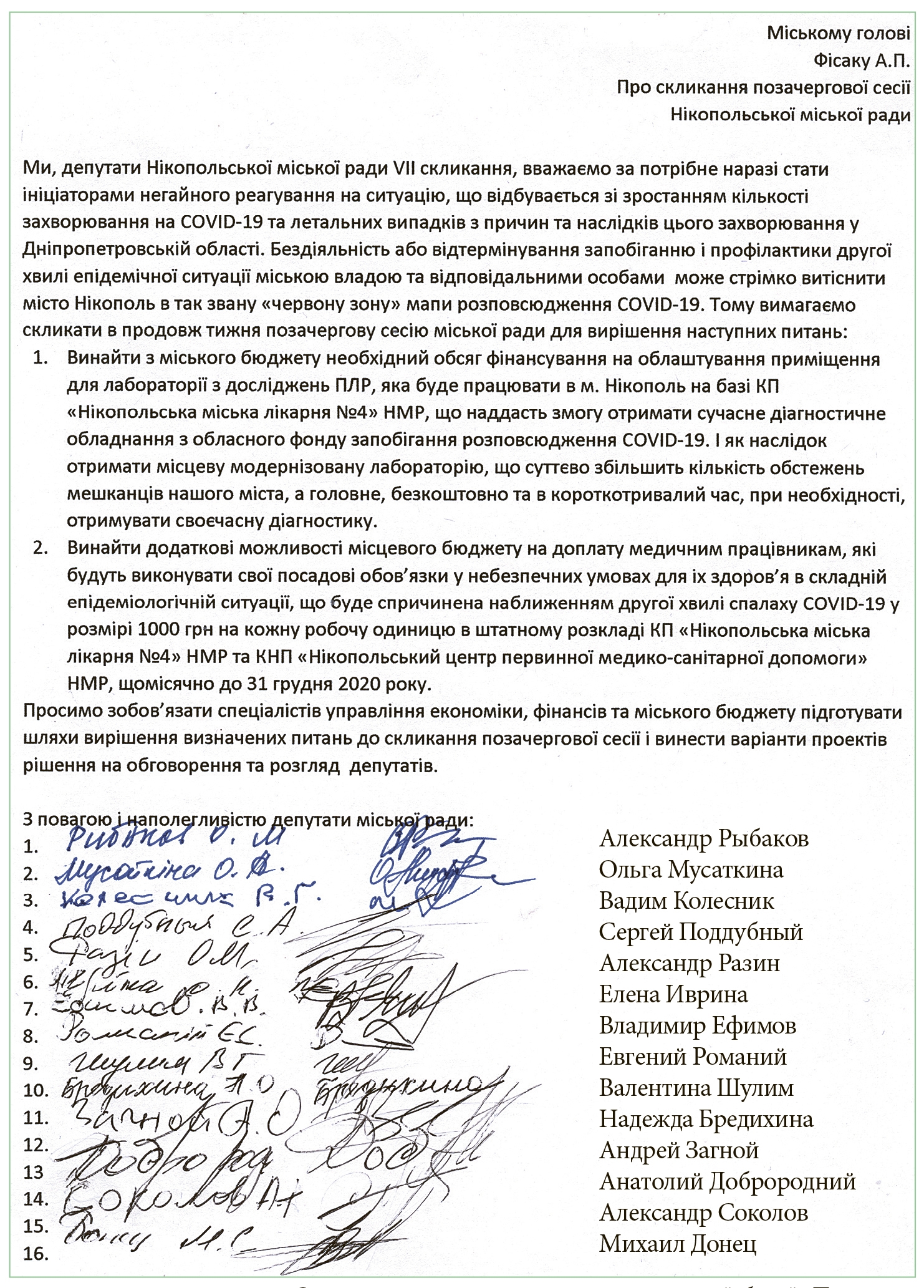 Для решения этих вопросов по инициативе «Громадської сили» и при поддержке депутатов большей части фракций созывается сессия Никопольского городского совета. Необходимое количество подписей было собрано во вторник, 6 октября. В нем принимали участие депутаты нескольких фракций городского совета.