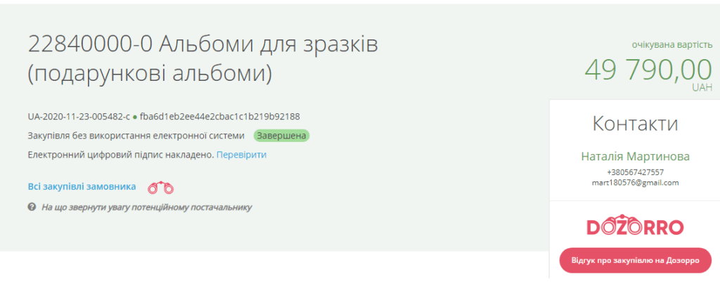 Альбомы покупали у ФЛП «Высоцкий Денис Викторович». В альбоме помещается до 300 фотографий. На обложке — иллюстрации президентской программы «Велике будівництво». Один такой подарочный альбом обошелся бюджету в 776 гривен. Как указано в договоре, их будут дарить на протокольно-публичных мероприятиях Всеукраинской ассоциации органов местного самоуправления.