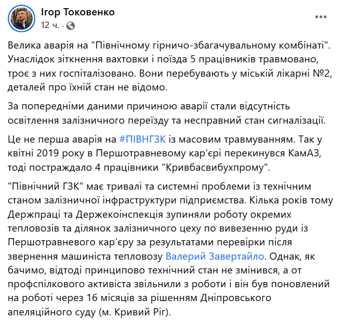 8 марта поздно вечером на территории Северного горно-обогатительного комбината в Кривом Роге случилась авария: столкнулись автомобиль, который перевозил рабочих смены, и грузовой поезд.